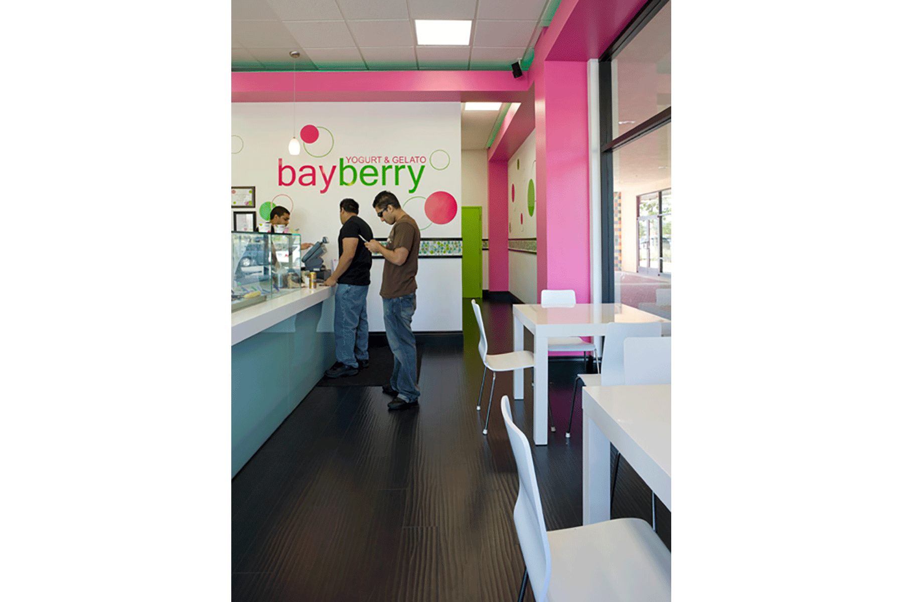 This small strip center yogurt shop emerged from a new shell space. Kathy worked with shopping center standards and an owner’s preferred colors and look to create a clean, tasty venue.