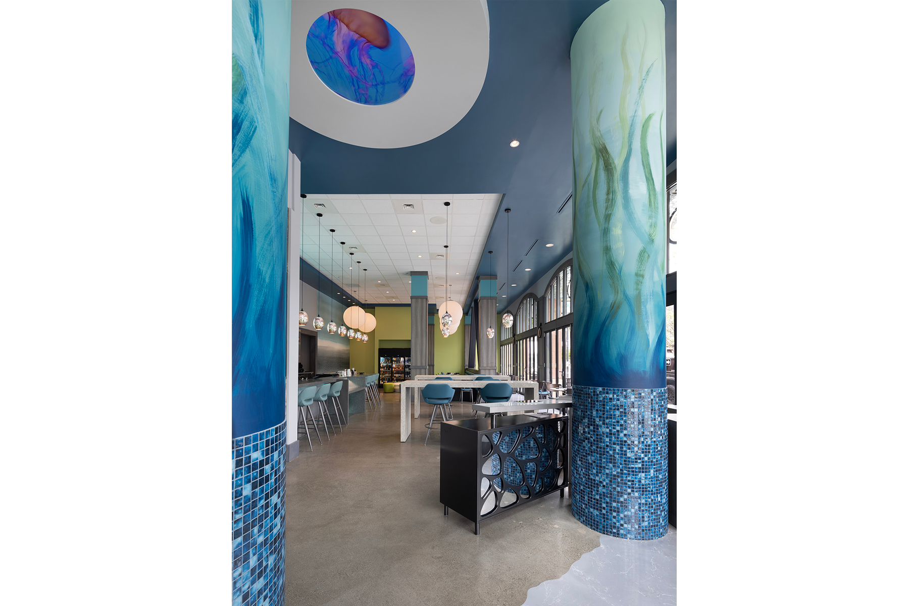 - A graphic designer consultant rendered a 22-foot-long x 11-foot-high seascape scene which designer laser-cut in thin gauge metal pairs and installed over 6-inch on center taught wire floor to ceiling grid.