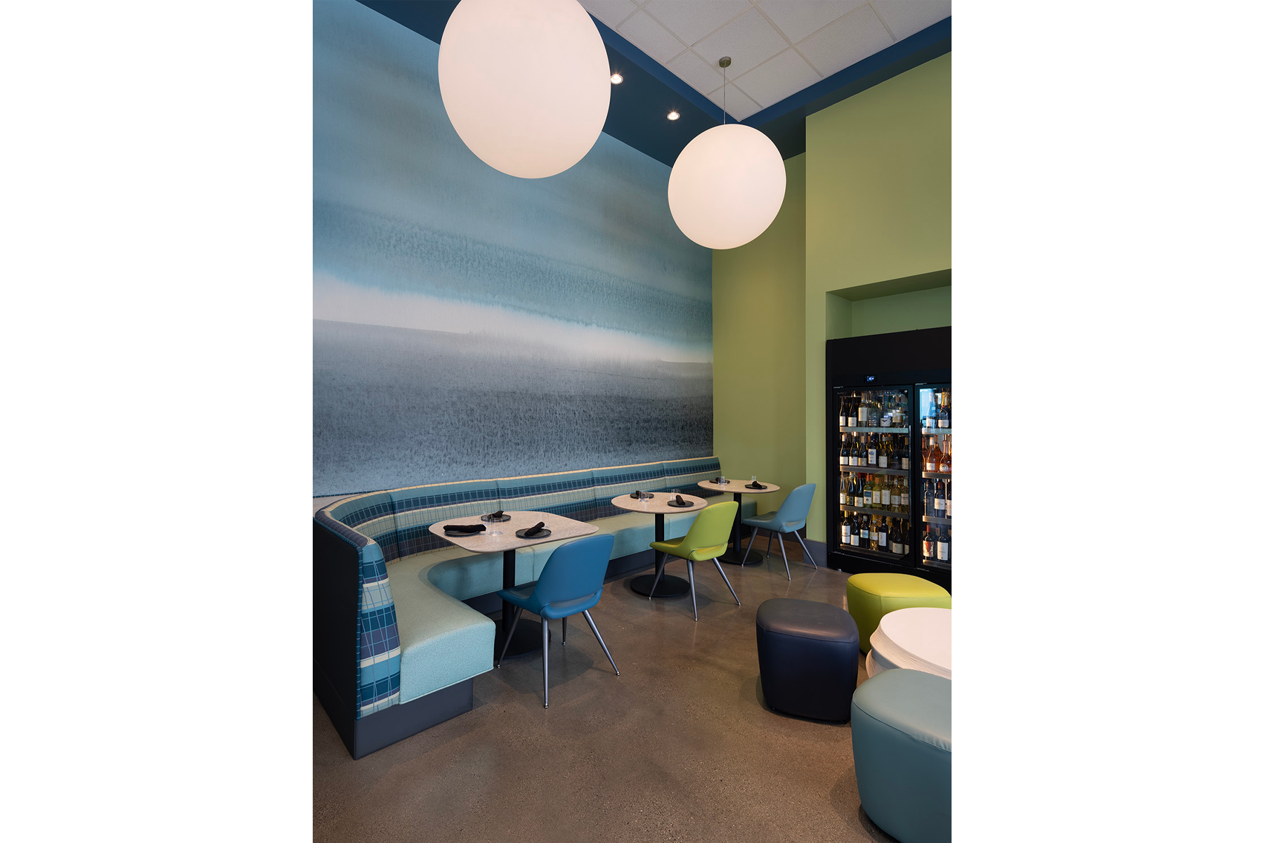 - A second larger bar in main dining room defied the barriers of large, angled steel earthquake retrofit columns where designers and fabricators worked their magic to create the back bar structure.